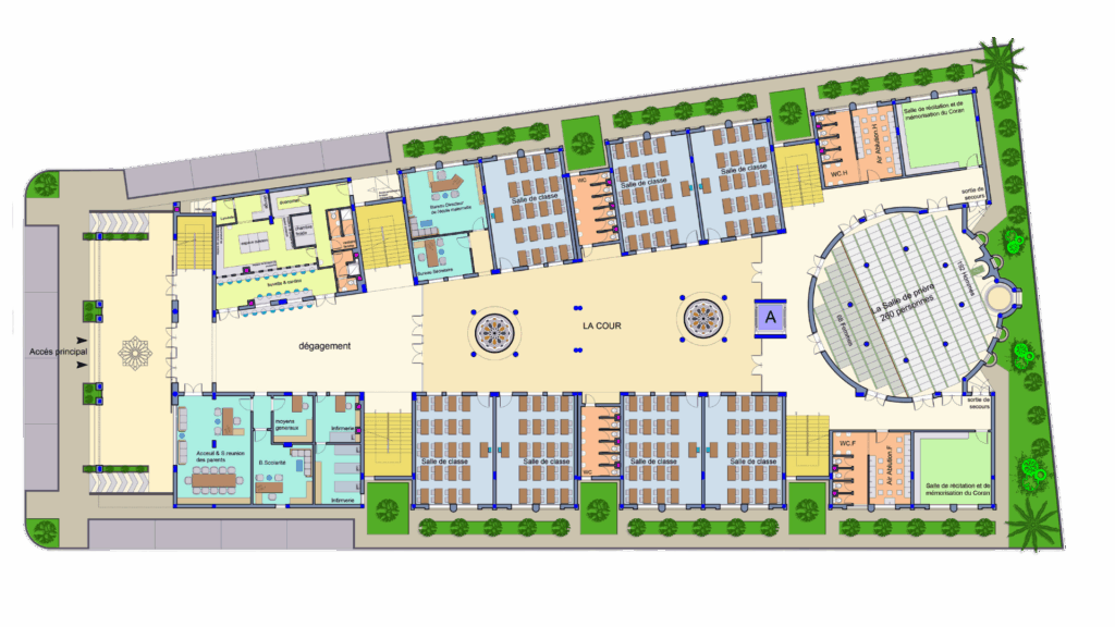 Mosquée & zones d’ablution hommes/femmes (260 places)
